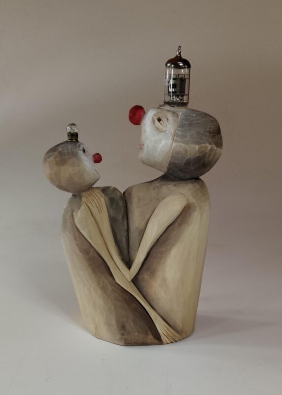 Řezba, kombinovaná polychromie s elektronikou a žárovkou